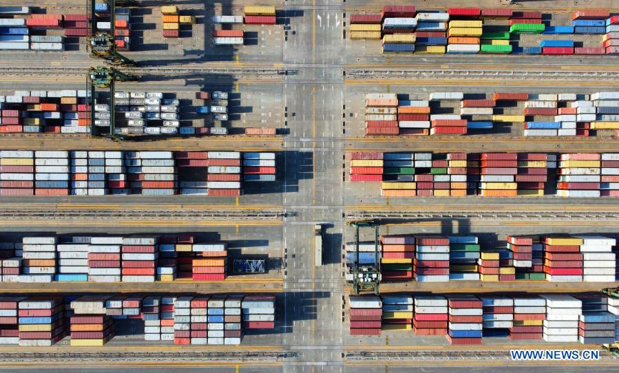 11日、天津港の太平洋国際コンテナふ頭に積み上げられたコンテナ。(小型無人機から、天津=新華社記者/趙子碩)