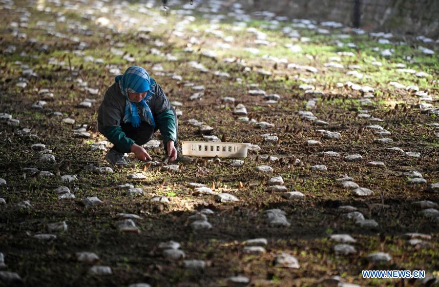 12日、銀川市西夏区鎮北堡鎮の農業用ハウスでアミガサタケを収穫する農家。(銀川=新華社記者/王鵬)