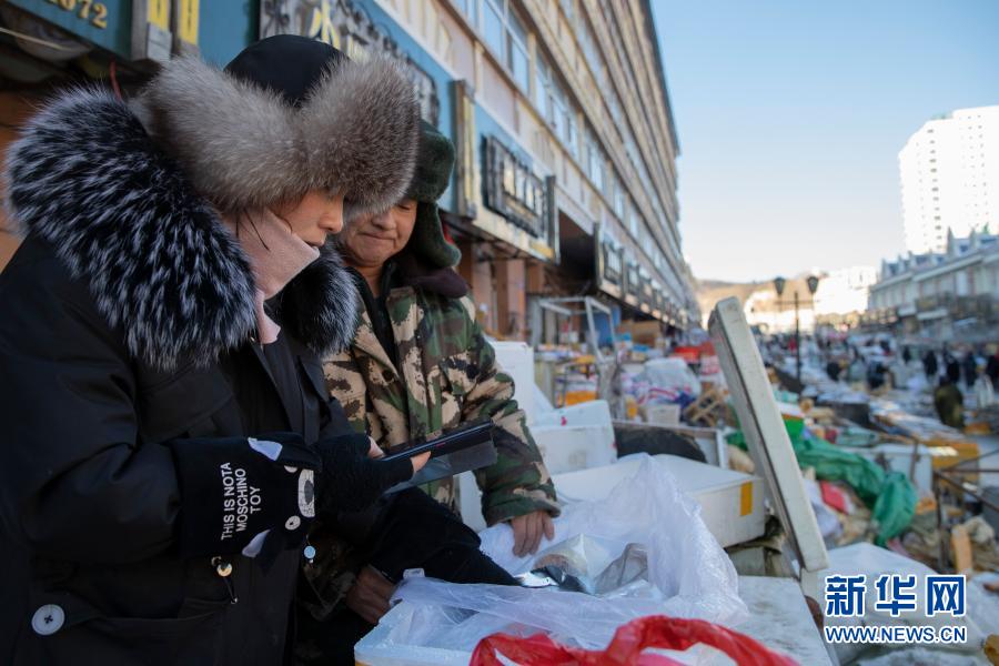 9日、黒竜江省撫遠市の「東極魚市」で、スマートフォンの画面を見ながら冷凍魚を選ぶ買い物客。(ハルビン=新華社配信/張濤)