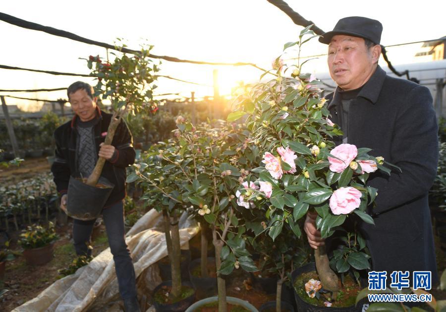14日、金華市婺城区羅店鎮後渓河村の紅紅植物農園で、咲き誇ったツバキを運ぶ栽培農家。(金華=新華社記者/翁忻暘)