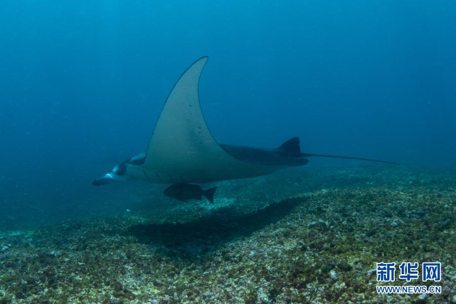 インドネシアのコモド国立公園の海域に生息するイトマキエイ(上)。(2018年10月28日撮影、ジャカルタ=新華社記者/杜宇)