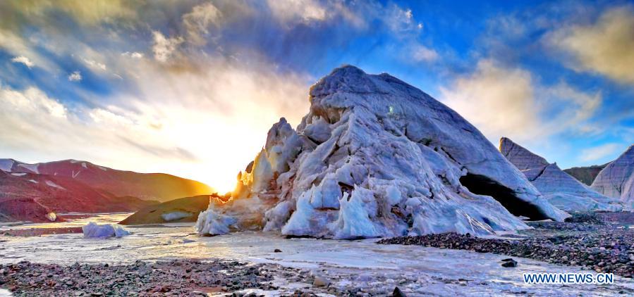15日、朝日に輝く普若崗日氷河の景色。(ナクチュ=新華社記者/沈虹氷)