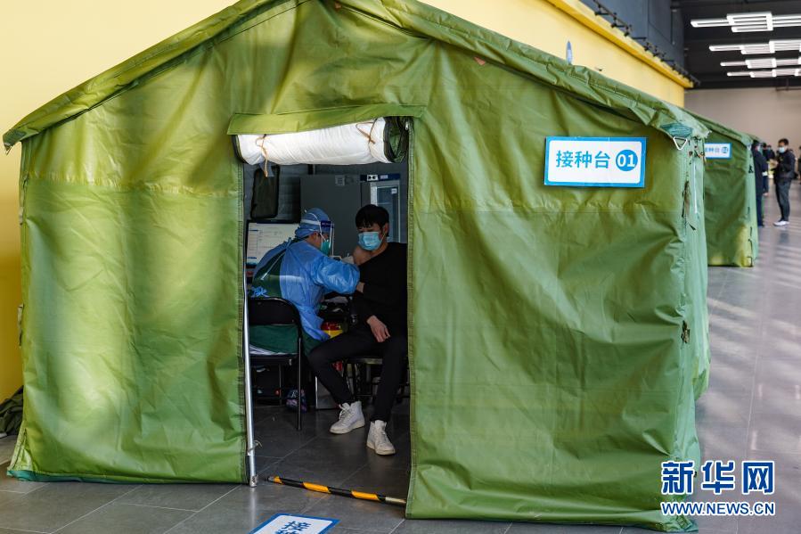 23日、北京市の大興区スポーツセンターで、2回目のワクチン接種を受ける市民。(北京=新華社記者/彭子洋)