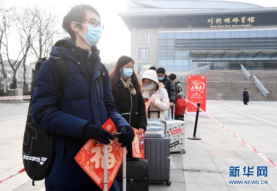 23日、北京大学邱徳抜体育館北広場のバス乗り場で、整列してバスを待つ学生。(北京=新華社記者/任超)
