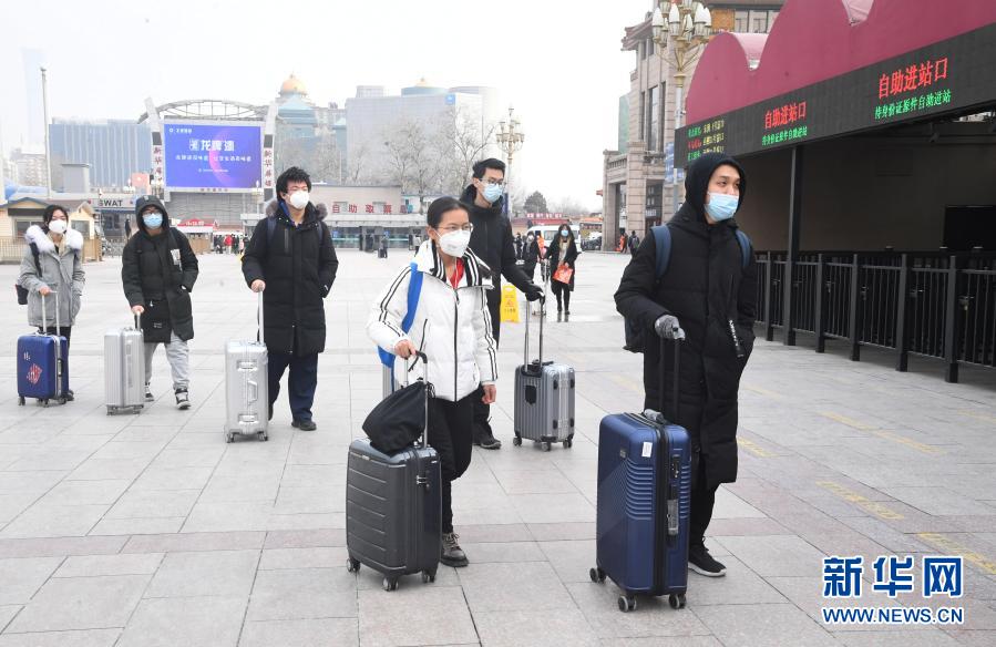 23日、北京駅広場で専用バスを降り、駅構内に向かう北京大学の学生。(北京=新華社記者/任超)
