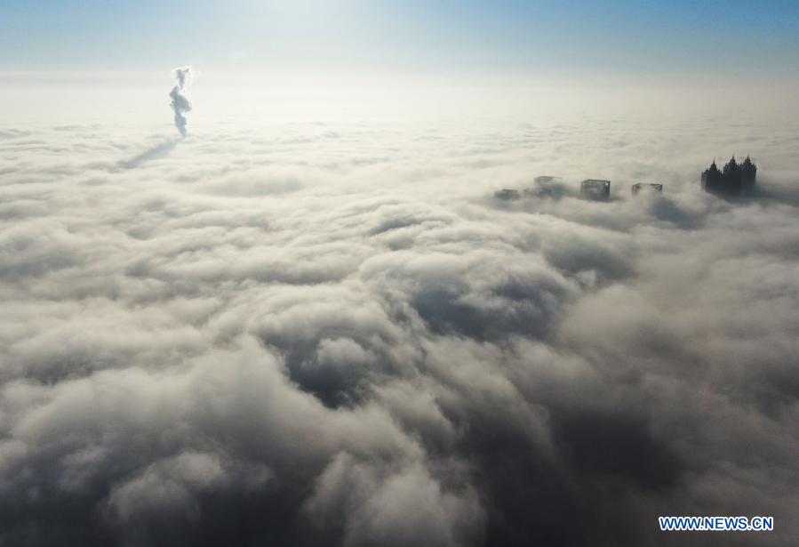 【新華社瀋陽1月29日】中国遼寧省瀋陽市で26日、濃霧が発生し、都心の高層ビル群が深い霧の中に見え隠れする幻想的な風景が広がった。