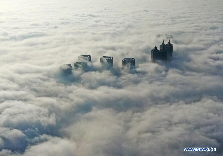 26日、遼寧省瀋陽市渾南区で、立ち込めた霧の間に見え隠れする高層ビル群。(小型無人機から、瀋陽=新華社記者/楊青)