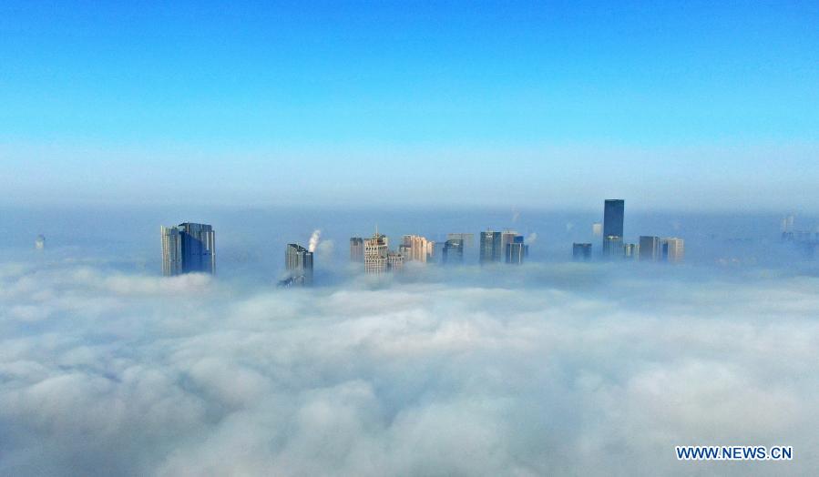 26日、遼寧省瀋陽市渾南区で、立ち込めた霧の間に見え隠れする高層ビル群。(小型無人機から、瀋陽=新華社記者/楊青)