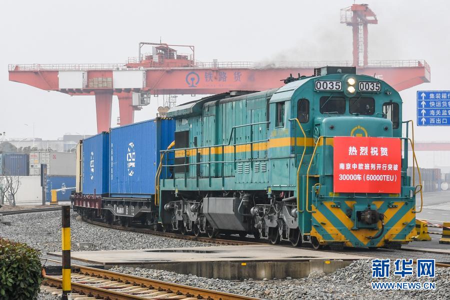 27日、南京貨物輸送センター尭化門駅を出発したロシア・ボルシノ行きの中欧班列。(南京=新華社記者/李博)
