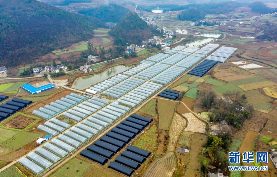 27日、黔西県錦星鎮白泥社区(コミュニティー)の生態イチゴ栽培拠点。(小型無人機から、畢節=新華社配信/范暉)