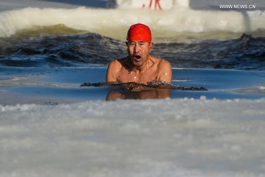 【新華社フルンボイル1月30日】中国内モンゴル自治区フルンボイル市は、中国で最も寒い地域の一つで、真冬には気温が氷点下30度に達する。寒中水泳愛好家の閆相斌(えん・そうひん)さん(58)は極寒の中、凍った伊敏河を掘って作ったプールで毎日泳いでいる。
