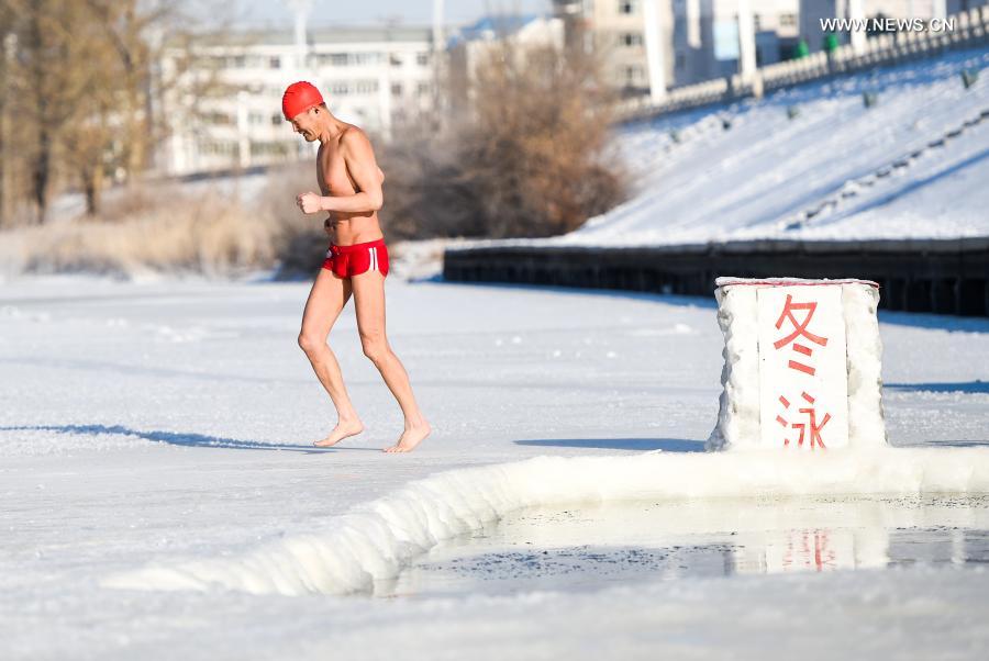 「氷のプール」で寒中水泳 内モンゴル自治区