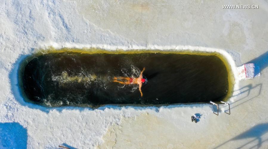 22日、凍った川を掘って作ったプールで泳ぐ閆相斌さん。(小型無人機から、フルンボイル=新華社記者/劉磊)