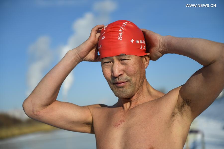 22日、寒中水泳の前に水泳帽をかぶる閆相斌さん。(フルンボイル=新華社記者/劉磊)