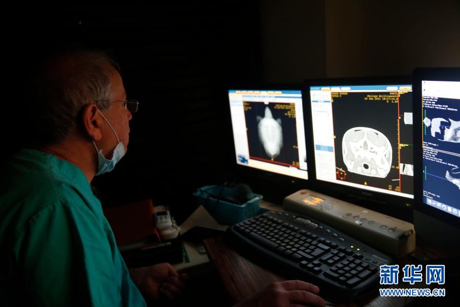 24日、イスラエル中部レホボトの動物病院で、けがをしたウミガメのCT検査をする獣医。(レホボト=新華社配信/Gil Cohen Magen)