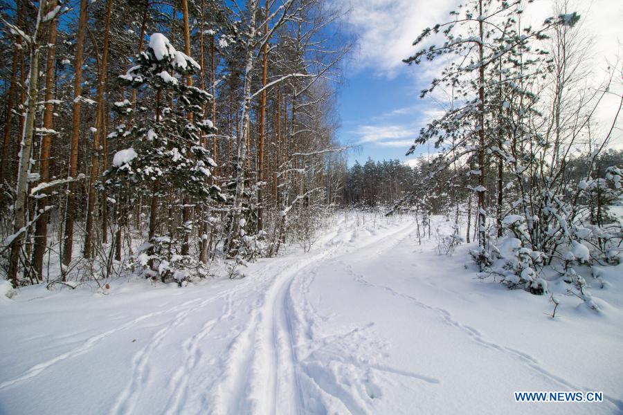 7日、ベラルーシ北西部ナリボキ森林の雪景色。(ミンスク=新華社配信)