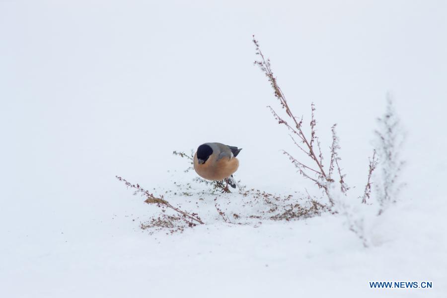 7日、ベラルーシ北西部ナリボキ森林の小鳥。(ミンスク=新華社配信)