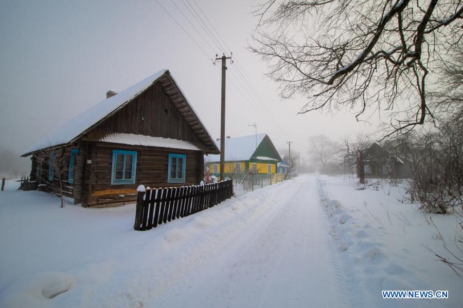 7日、ベラルーシ北西部ナリボキ森林にある集落の雪景色。(ミンスク=新華社配信)
