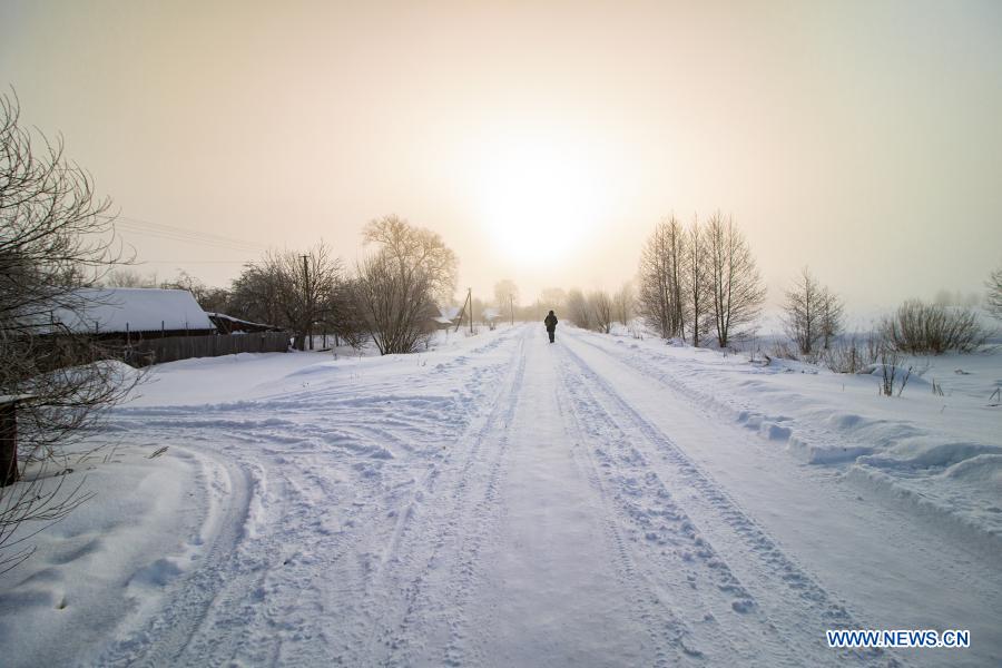 7日、ベラルーシ北西部ナリボキ森林にある集落の雪景色。(ミンスク=新華社配信)