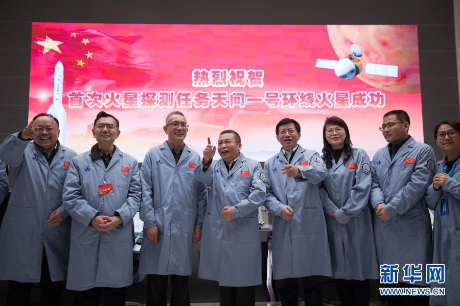 10日、北京航天飛行制御センターで探査機の火星軌道入りを喜ぶ技術者。(北京=新華社記者/金立旺)