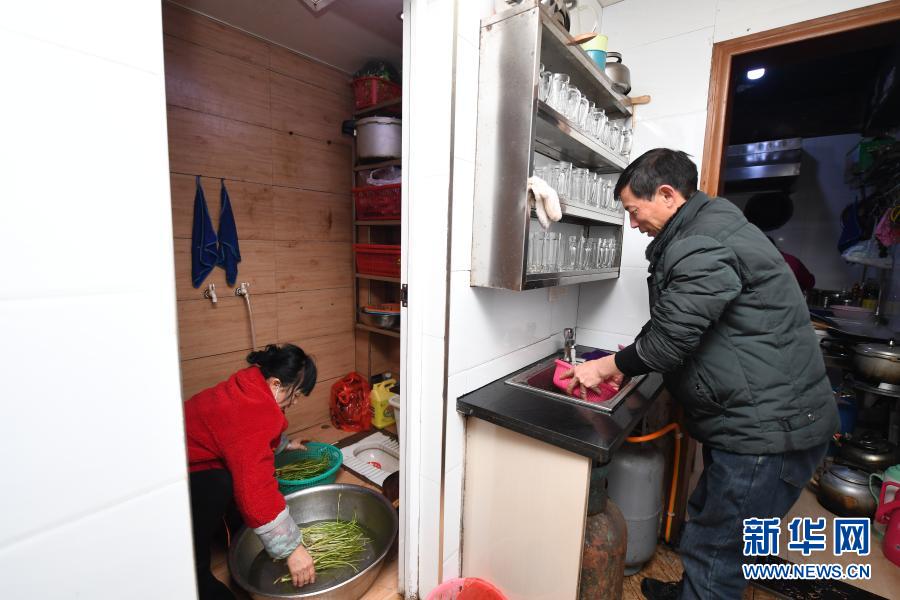 11日、沅江市に開いた魚料理の店で、一家だんらんの食事を準備する石仲芳さんと妻の李莉華さん。(益陽=新華社記者/薛宇舸)