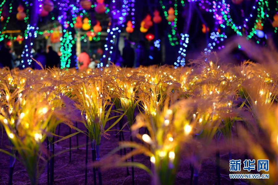 14日、山西省汾陽市賈家荘村の民俗廟会できらびやかに輝くランタン。(汾陽=新華社記者/曹陽)