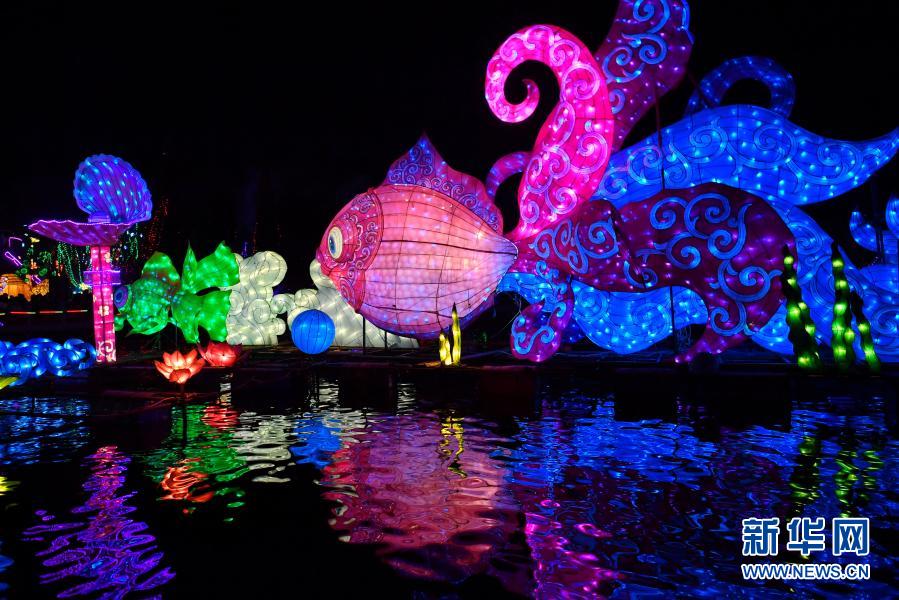 14日、山西省汾陽市賈家荘村の民俗廟会できらびやかに輝くランタン。(汾陽=新華社記者/曹陽)