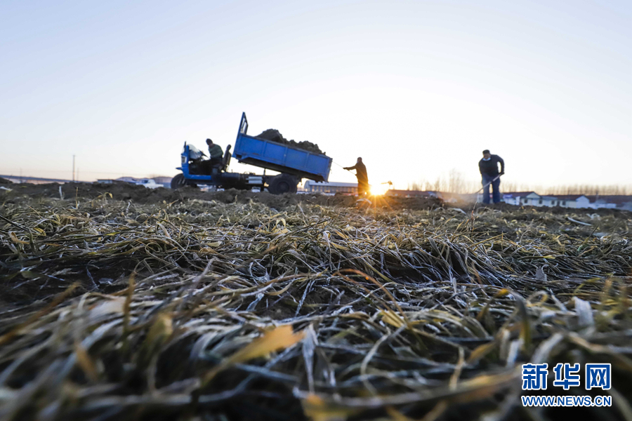 17日、河北省遵化市東新荘鎮西梁子河村の麦畑に自給肥料をまく農家の人たち。(唐山=新華社配信/劉満倉)