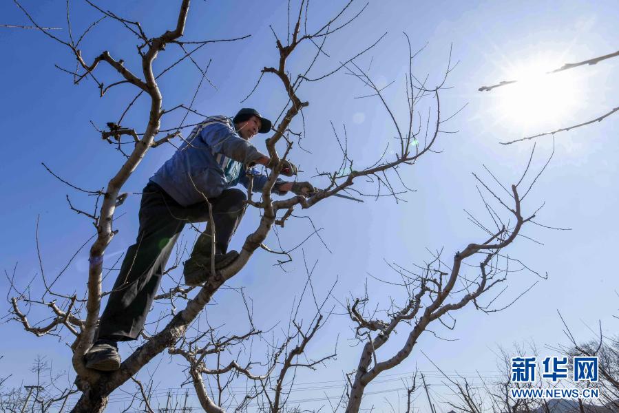 17日、山東省青州市雲門山街道付家村で桃の木を剪定する桃農家の人。(濰坊=新華社配信/王継林)