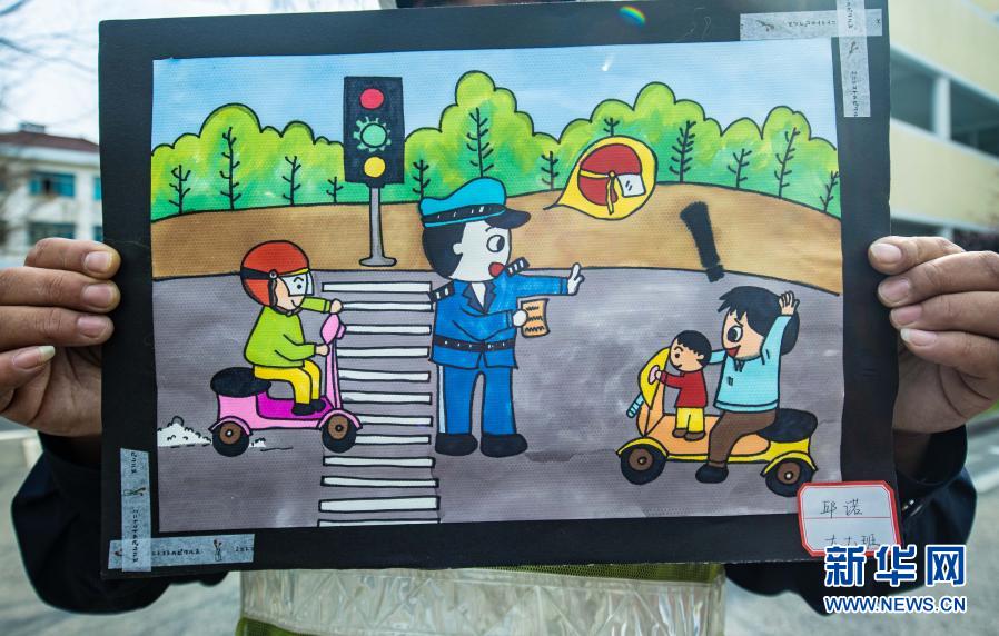10日、警察官に交通安全に関する絵画作品を贈呈する子ども。(湖州=新華社記者/徐昱)