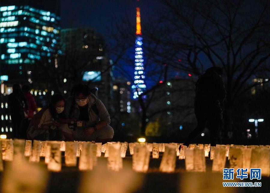 11日、東京・六本木の東京ミッドタウンで、被災者のメッセージが記された和紙キャンドルに火をともすイベントに訪れた人たち。(東京=新華社配信)