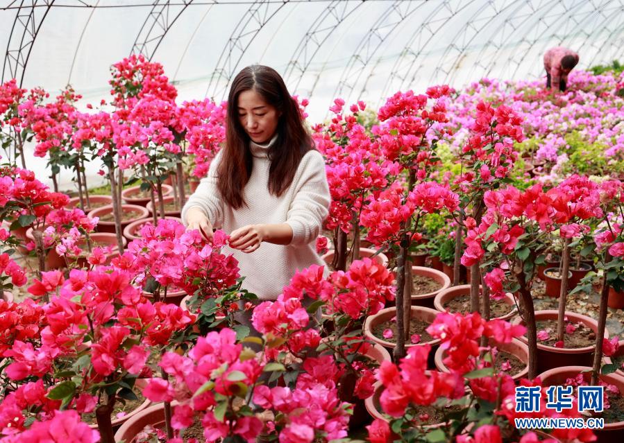 12日、唐山市豊南区黄各荘鎮にある花卉栽培基地の温室でブーゲンビリアの世話をする従業員。(唐山=新華社記者/楊世尭)