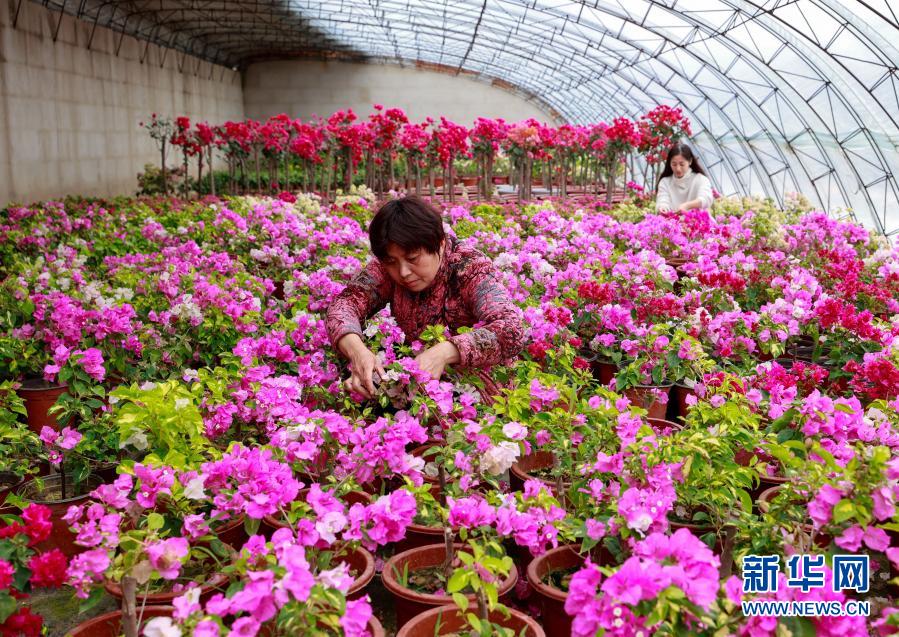 12日、唐山市豊南区黄各荘鎮にある花卉栽培基地の温室で花の世話をする従業員。(唐山=新華社記者/楊世尭)