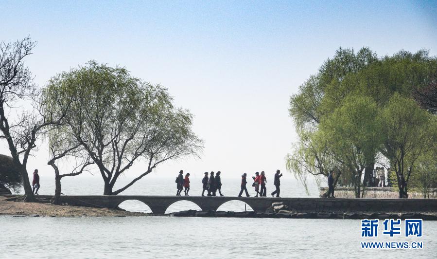 13日、太湖黿頭渚景勝地を散策する観光客。(無錫=新華社記者/楊磊)