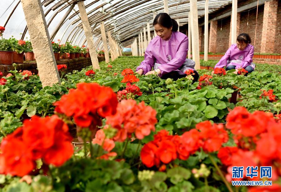 12日、刑台市南和区和陽鎮南関村の農業用ハウスで、花の手入れをする農家の人たち。(石家荘=新華社記者/朱旭東)