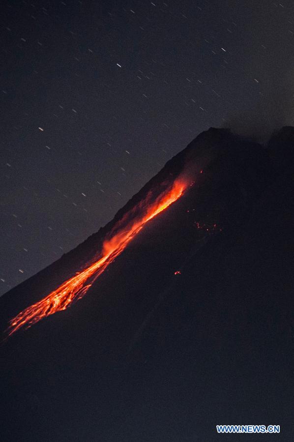 18日、ムラピ山で山肌を流れ落ちる溶岩流。(ジョグジャカルタ=新華社配信)