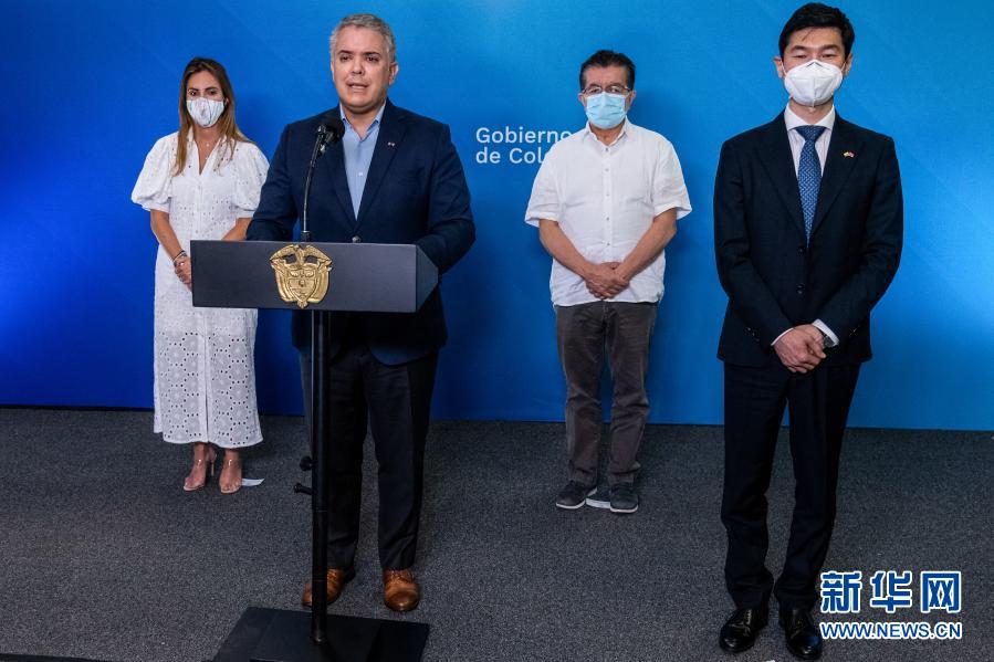 コロンビア北部バランキージャで開いた記者会見で、新たな新型コロナウイルスワクチンの到着を発表する同国のドゥケ大統領(前列左)と中国の藍虎(らん・こ)駐コロンビア大使(前列右)。(ボゴダ=新華社配信/コロンビア大統領府提供)