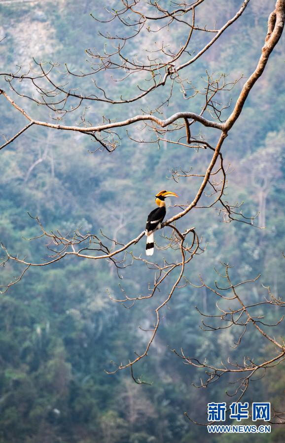 19日、木の枝に止まるオオサイチョウ。(盈江=新華社記者/王冠森)