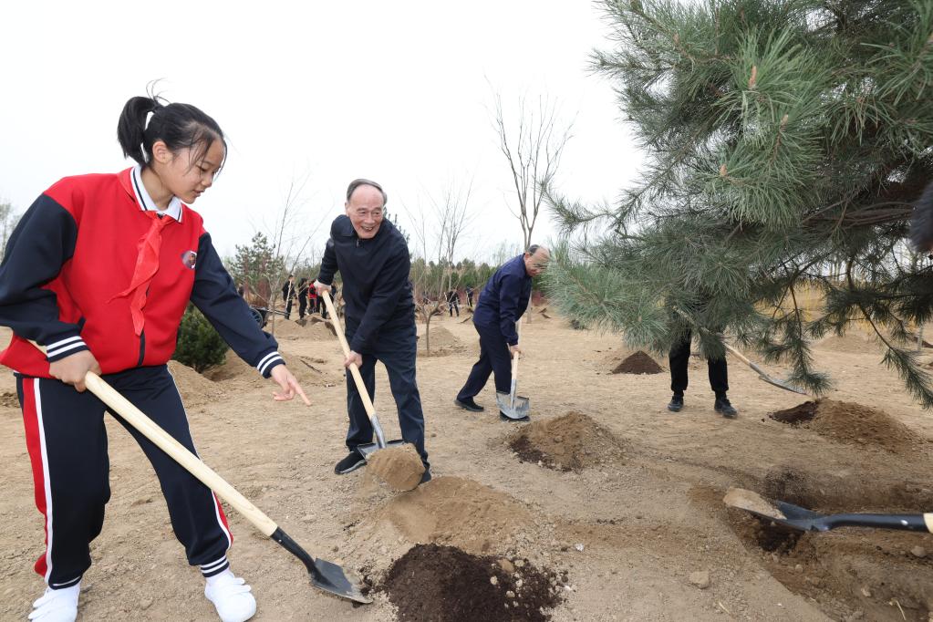 2日、植樹活動に参加した王岐山氏(左から2人目)。(北京=新華社記者/劉彬)