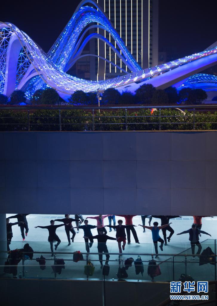 2日夜、武漢市にある光谷広場の地下スペースで運動する市民。(武漢=新華社配信/伍志尊)