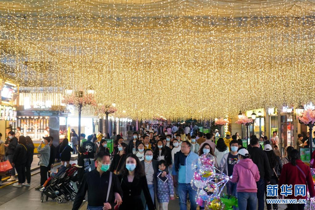 3月28日夜、武漢市の楚河漢街で街歩きを楽しむ市民。(武漢=新華社記者/程敏)