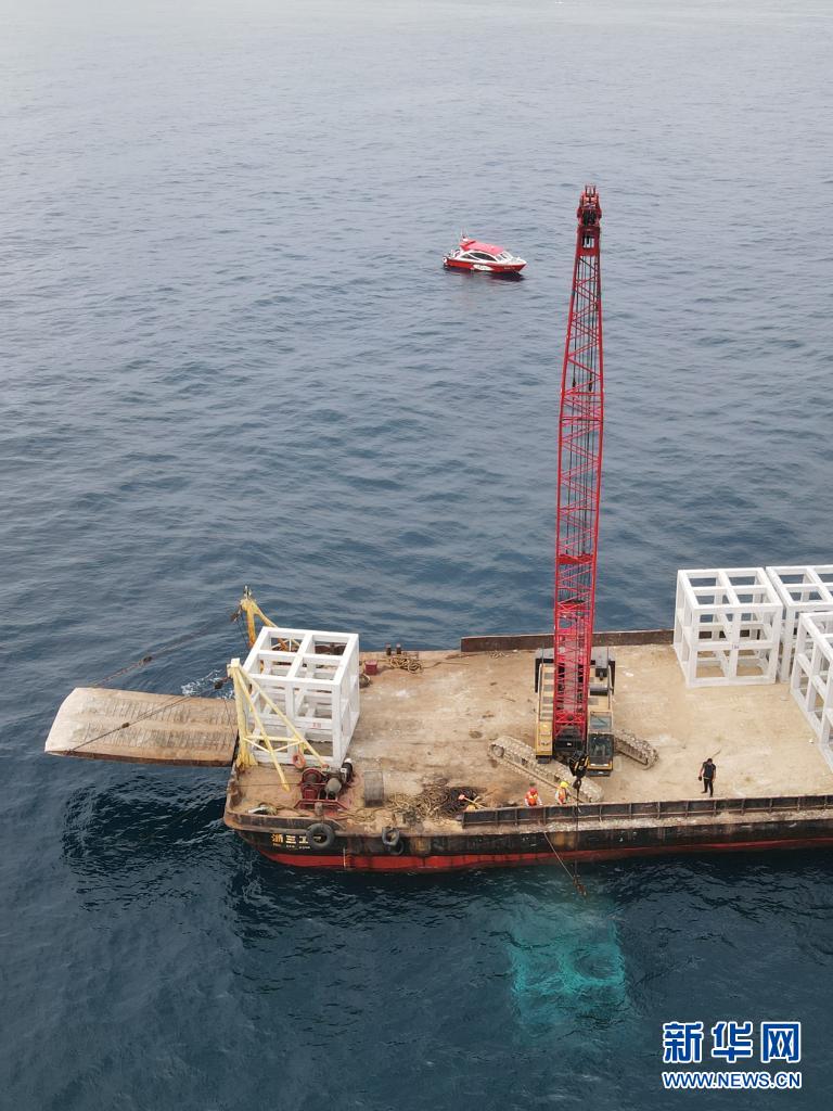 1日、三亜市蜈支洲島海域での人工漁礁設置作業。(小型無人機から、海口=新華社記者/張麗蕓)