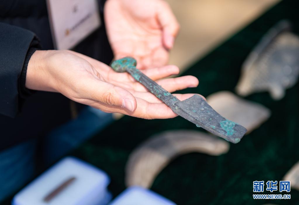 8日、瑠璃河遺跡の版築基礎遺構付近で出土した青銅環首刀を見せる考古学スタッフ。(北京=新華社記者/陳鍾昊)