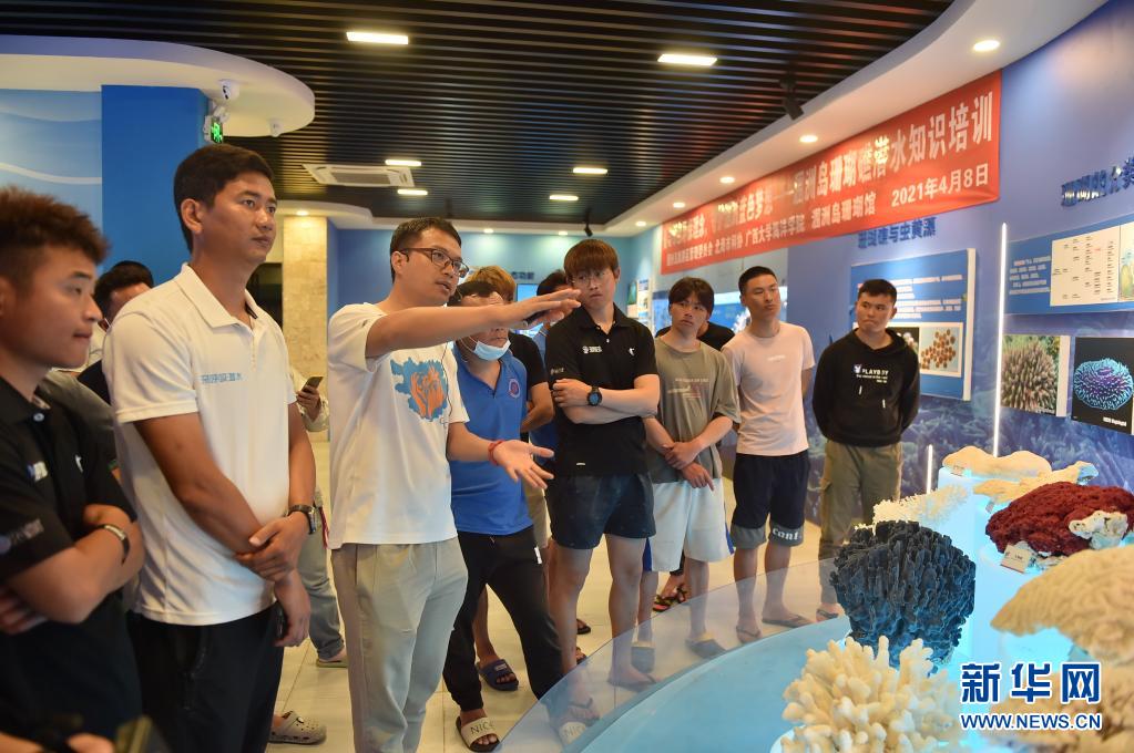 8日夜、潿洲島サンゴ館で、同島のレジャーダイビング業の従事者にサンゴの保護について講義する黄雯さん(手前左から3人目)。(北海=新華社記者/劉嶺逸)