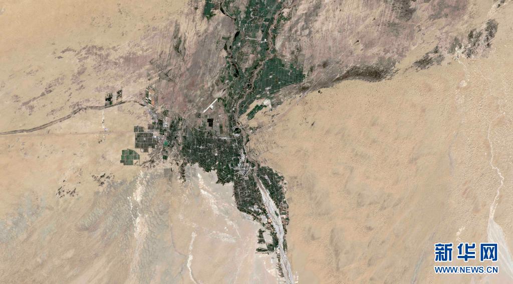 新疆ウイグル自治区チャルチャン県の河東治砂ステーションの衛星画像。(資料写真、ウルムチ=新華社配信)