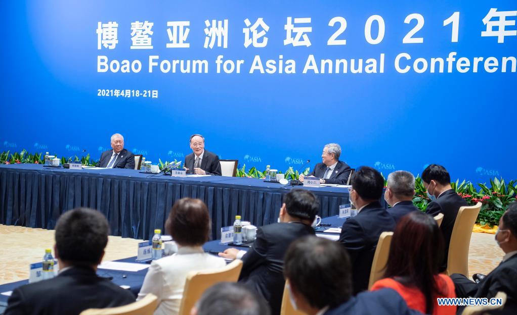 中国の王岐山国家副主席は20日、海南省の博鰲(ボアオ)でボアオ・アジアフォーラム2021年年次総会の開幕式に出席し、同フォーラムの理事や戦略協力パートナーと集団会見し、国内外の企業家代表と座談会を行った。(ボアオ=新華社記者/李濤)