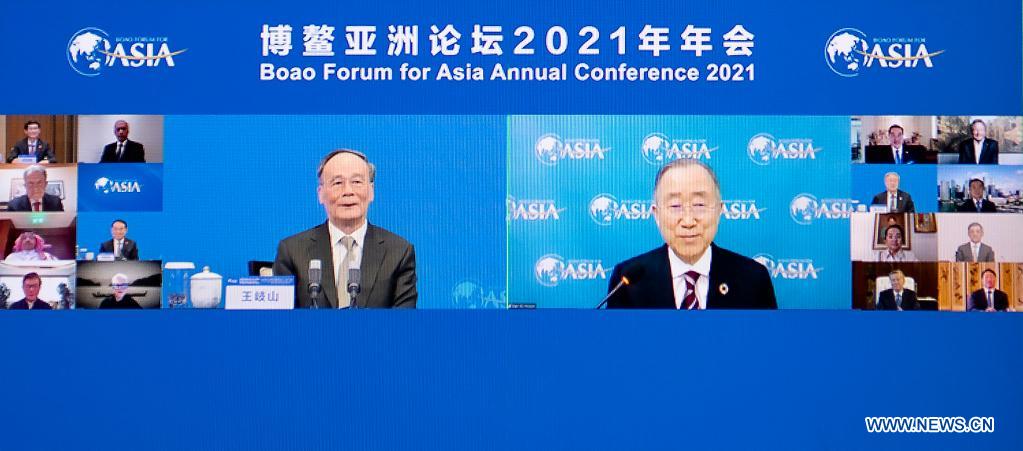 中国の王岐山国家副主席は20日、海南省の博鰲(ボアオ)でボアオ・アジアフォーラム2021年年次総会の開幕式に出席し、同フォーラムの理事や戦略協力パートナーと集団会見し、国内外の企業家代表と座談会を行った。(ボアオ=新華社記者/李濤)