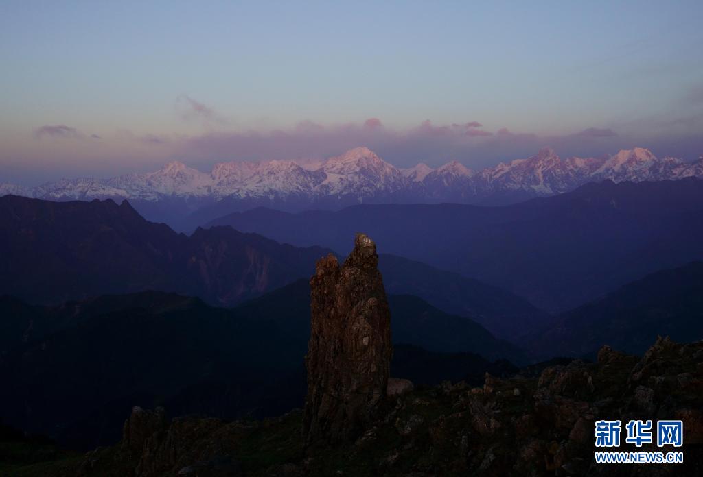 2日、朝日に照らされたミニヤコンカの峰。(成都=新華社記者/江宏景)