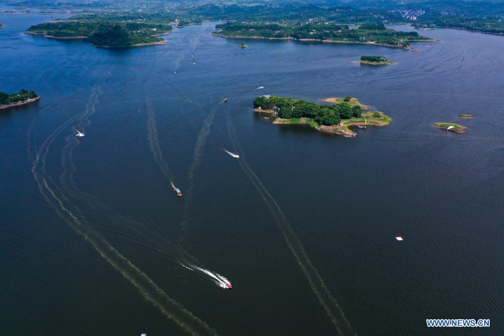 2日、重慶市の長寿湖景勝地で、観光客を乗せて進むさまざまなタイプの遊覧船。(小型無人機から、重慶=新華社記者/劉潺)