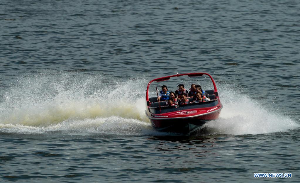 2日、重慶市の長寿湖景勝地で、モーターボートに乗る観光客。(重慶=新華社記者/劉潺)